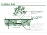 tree planting detail | | | | This detail shows the landscape installer how to plant a tree so as to insure the tree stays healthy. The best time to prevent tree problems is when the tree is planted, because you can spot any problems with the roots (a root curling around the container, for instance) and you can make sure the tree is planted so that the root crown--where the top roots connect to the trunk--is a few inches above the final grade. Many long-term problems with trees can begin because the root crown has been buried, which encourages fungal infections. |