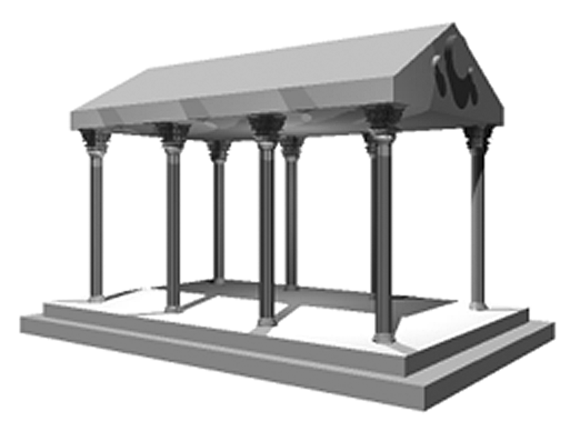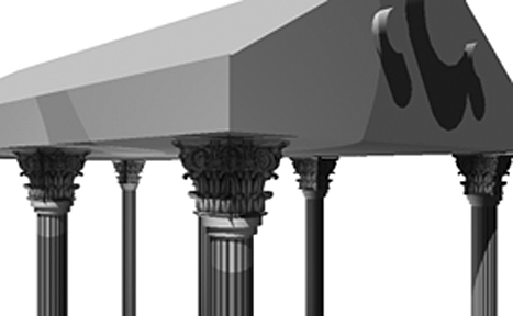The Corinthian column represents a interesting modeling problem. It's important for the capital to look correct if the model is to be believable, however if you actually model the capital, you could spend the entire budget modeling the column alone--and your computer would spend all of its time rendering just the columns. Fortunately, there are methods that we can use that to simplify the process. These techniques require that the rendering software support multiple surface maps for a single texture, including a color map, bump map, and a transparency map. |
